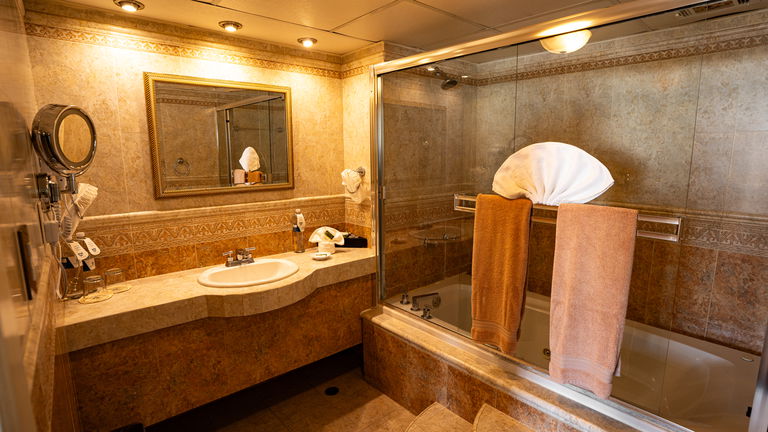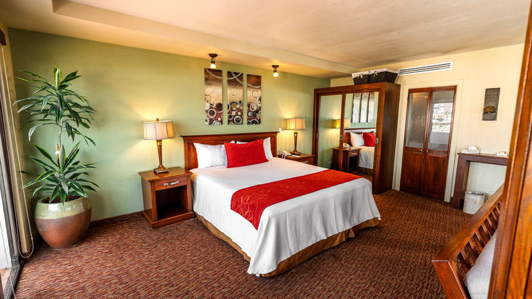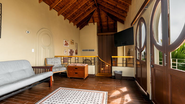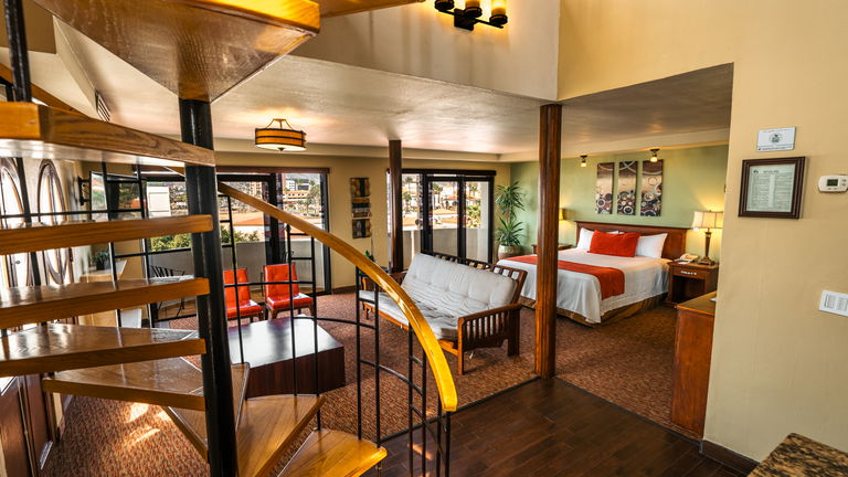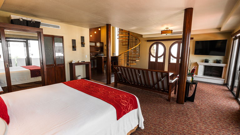 Habitación de 84 m2 de dos pisos con una recamara principal con cama King size de memory foam y 2 sofás camas ubicados en la primera y segunda planta. El gran atractivo de nuestra suite es que cuenta con una chimenea y con una preciosa vista a la bahía la cual se puede apreciar desde cualquiera de sus cuatro balcones