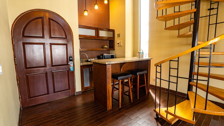 Está equipada con cocineta y barra con cubiertas de granito, refrigerador, microondas, cafetera, un baño completo con tina de hidromasaje, aire acondicionado, acceso a Wifi, dos televisiones Smart TV con extensa variedad de canales de tv, amplio ropero, caja de seguridad, plancha y tabla para planchar, cerraduras con tecnología de proximidad, teléfono.